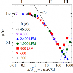 In regime II, stress builds primarily at the edges of the contact until a lattice dislocation develops and glides through the contact. The nucleation instability undercuts the ability of the friction to raise to , and the newly-uncovered scaling